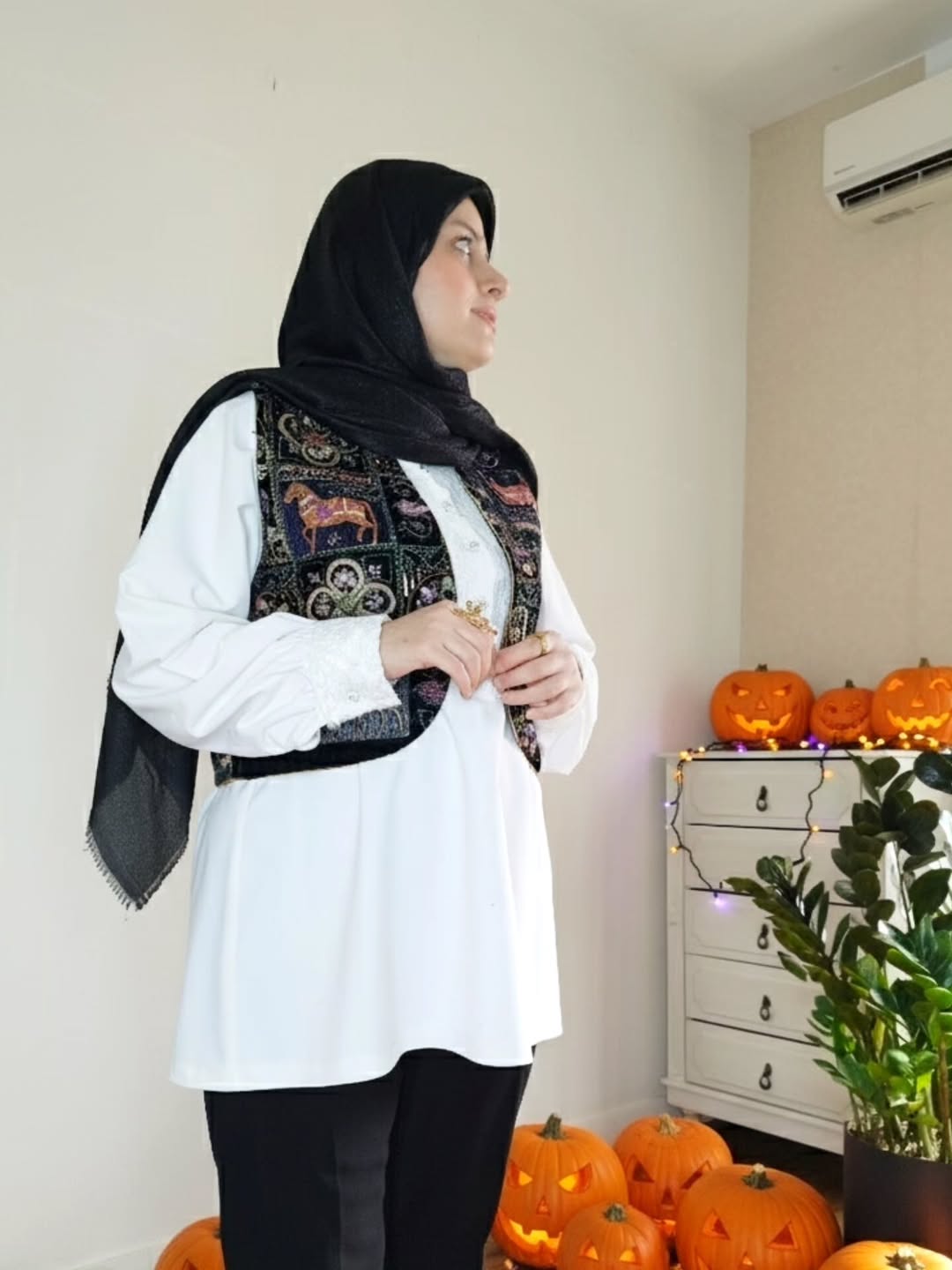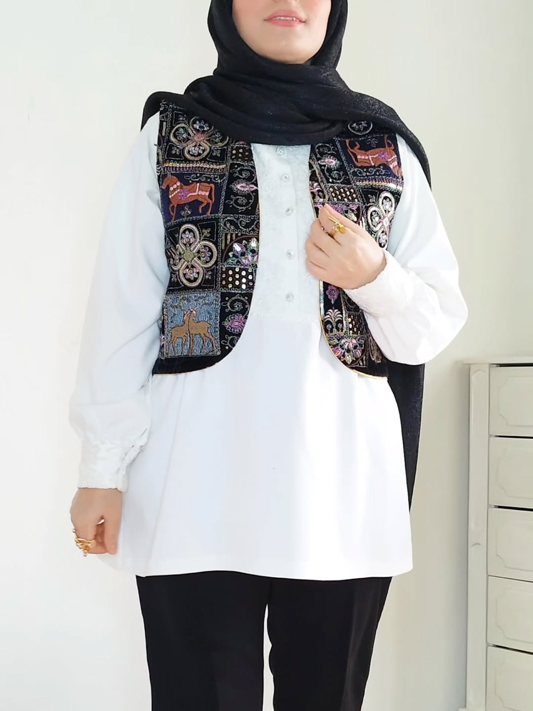 استایل متفاوت و شیک برای پاییز ترکیب جلیقه مخمل نه هزار هندی با گلدوزیهای چشمنواز، روی شومیز کرپ زبده که حاشیهی گیپور ظریفش زیبایی رو دوچندان کرده! یک ست کلاسیک و در عین حال ترندی که مناسب هر سلیقهایه.